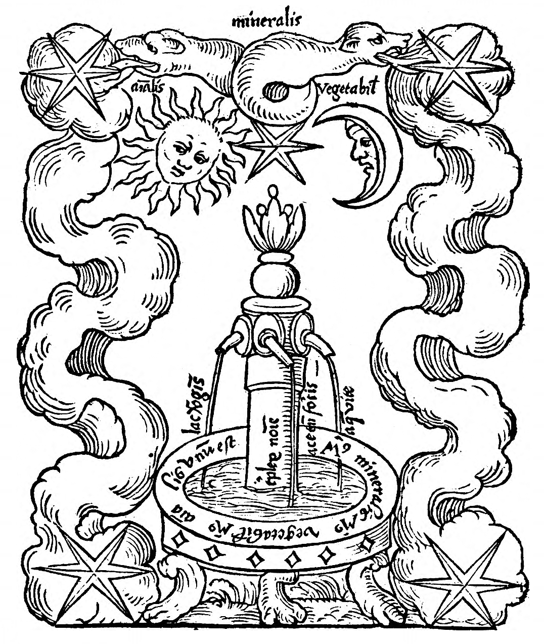 Figure 1. Surrounding top of frame: mineralis / a[n]i[m]alis / vegetabil[is] (“mineral / animal / vegetable”). Along streams of liquid, left to right: lac v[ir]gi[ni]s / / acetu[m] fo[n]tis / aq[ua] vit[a]e (“virgin’s milk / vinegar of the spring / water of life”). On the fountain: t[ri]plex no[m]i[n]e (“threefold by name”). Clockwise along the rim: M[ercurius] mineralis M[ercurius] vegetabil[is] M[ercurius] a[n]i[m]a[lis] sic unu[m] est (“mineral Mercury, vegetable Mercury, and animal Mercury are one in this way.”)
