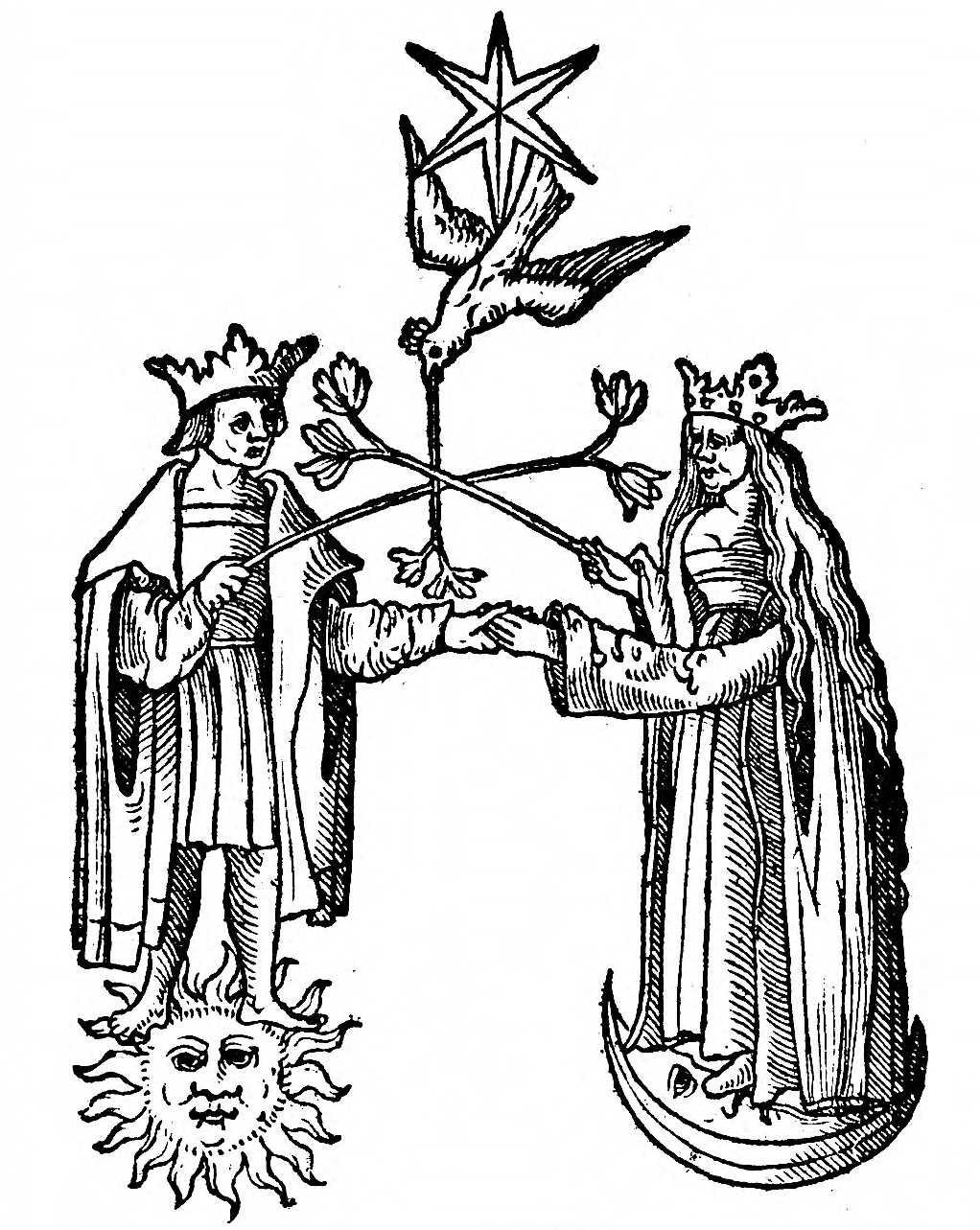[1] No verse accompanies this woodcut in the 1550 edition. In the 1530s manuscript, a verse appears as follows: Ich pin ain Kunig mechtig und mit gSundem lib / Min hertz und gmuet senet sich nach aim wib. // Ain Kunigin pin ich von edler art / Ain gemachel gezimty minem lib zart. “I am a mighty King with a healthy body. / My heart and mind long for a wife. // I am a queen of noble birth; / My delicate body shall have a husband.”